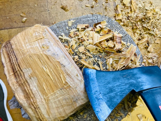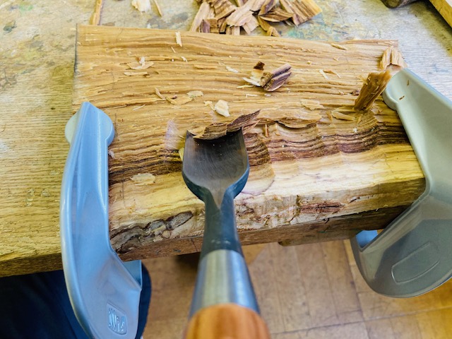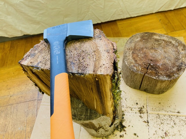 私は斧を使うこともほとんど初めて。ずっしりとしていますね。この斧で2cmくらいのお皿の材を取っていきます。しかし、狙った場所に刃を下ろすのも一苦労です。その上からハンマーで割れ目を深めていきます。初めてのことばかりです。