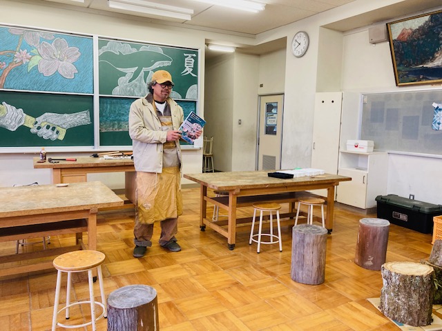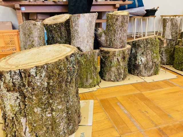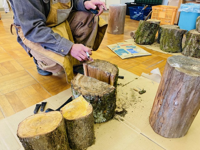 会場の久目地区交流館の一室には、前日に切られたばかりの柿の木と栗の木の切り株が、どーんと置かれていました。苔が生えてかっこいい木々です。今日はなんとこの切り株から、なんとお皿を作りましょうというワークショップです。
