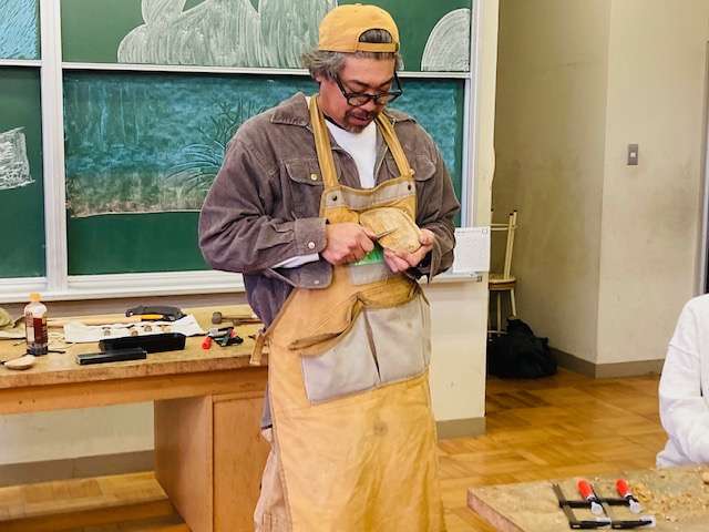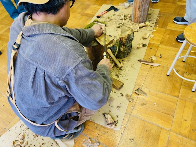 講師の林篤宏さんは、利賀村でグリーンウッドワーカーとして活動されています。グリーンウッドワークとは、生木を使った木工です。岐阜県で指導者養成講座を受講し、林業をやりながら普及活動を行っておられるそうです。