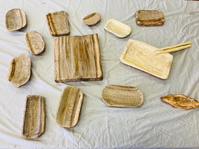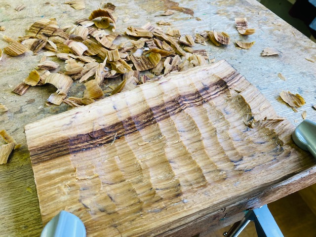 斧で傷ついたお皿を削って、きれいなの木を表面に出して行くのですが、これもなかなか難しい。