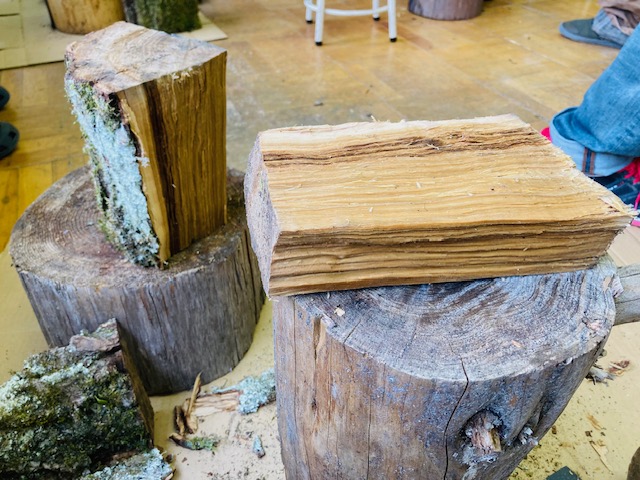 黄色いのは柿の木で、茶色いのは栗の木。この時点ではずっしりと重いですが、徐々に水分が抜けて、かなり軽くなるそうです。変わっていく様子も楽しみですね。