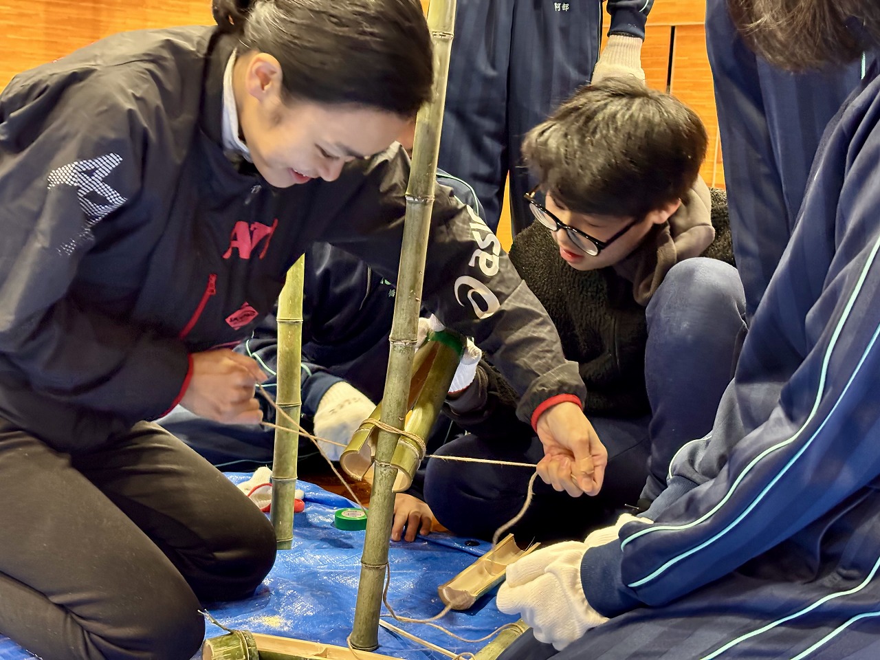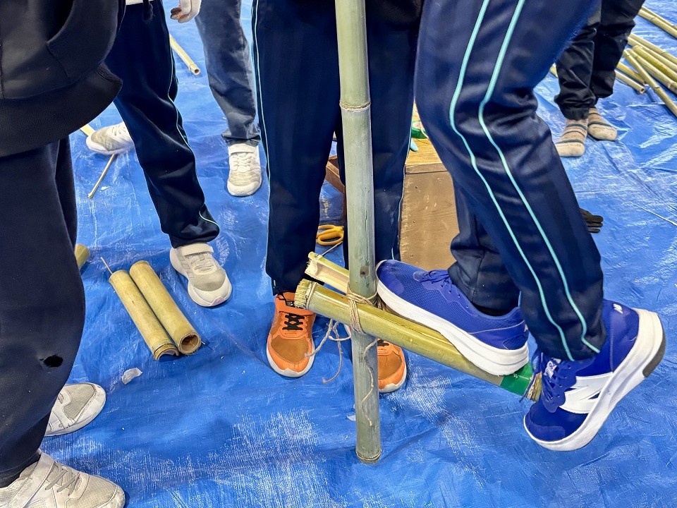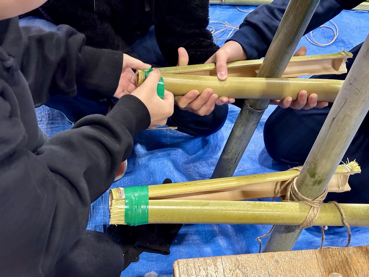 縛り方がうまくできていなかったり、きつく縛れなかったりすると、竹がずり落ちてしまったり、グラグラ動いてしまったり・・。でも最初の三上さんの言葉通り、自分たちで考えて工夫したようです。こちらのグループはテープで補強して動かないようにしていました。グループ内で「こうしたほうがいいんじゃない」「やってみよう」など声掛けが聞こえてきました。