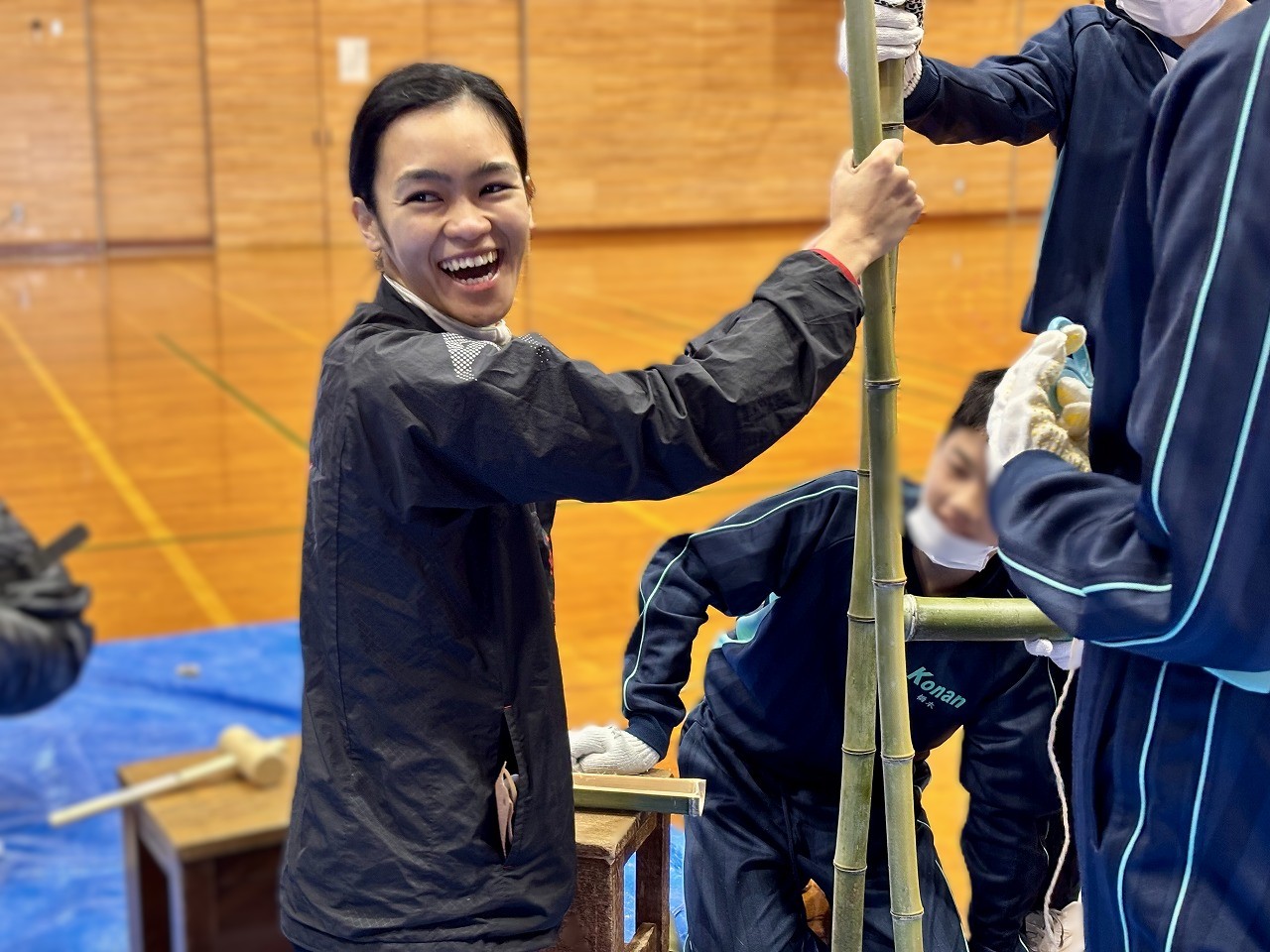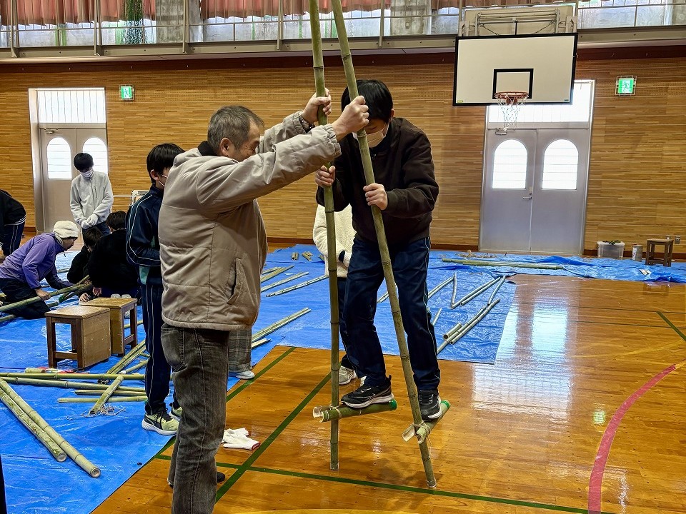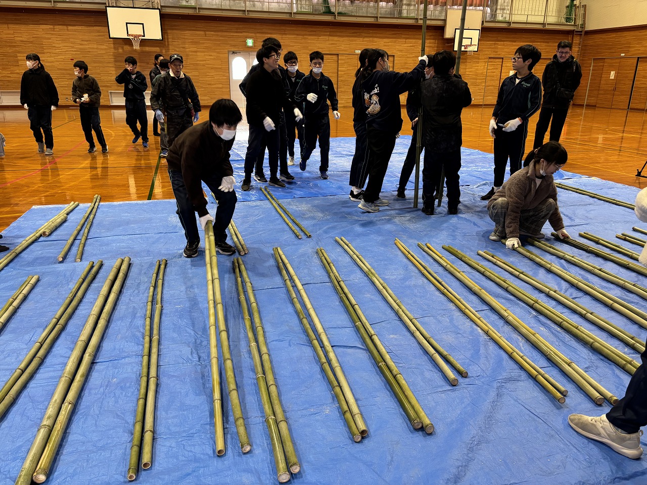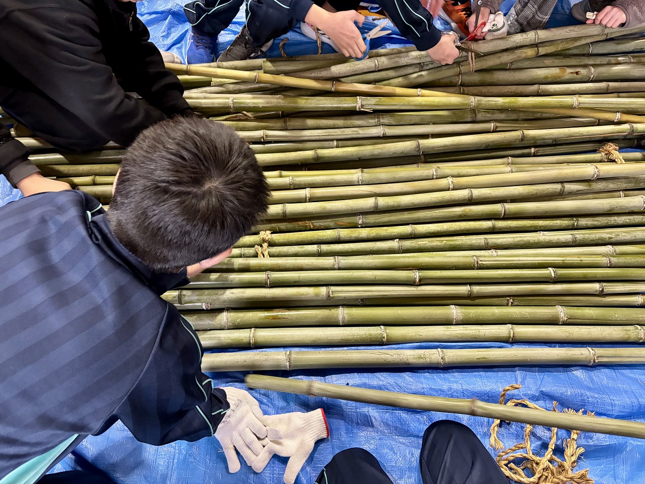 縛り方がうまくできていなかったり、きつく縛れなかったりすると、竹がずり落ちてしまったり、グラグラ動いてしまったり・・。でも最初の三上さんの言葉通り、自分たちで考えて工夫したようです。こちらのグループはテープで補強して動かないようにしていました。グループ内で「こうしたほうがいいんじゃない」「やってみよう」など声掛けが聞こえてきました。