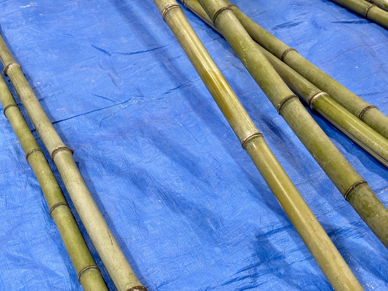 縛ってあった竹を広げてみて、大体の高さが同じような竹を2本ずつ並べます。5グループに分かれてひとり2本ずつ好きな竹を選びます。